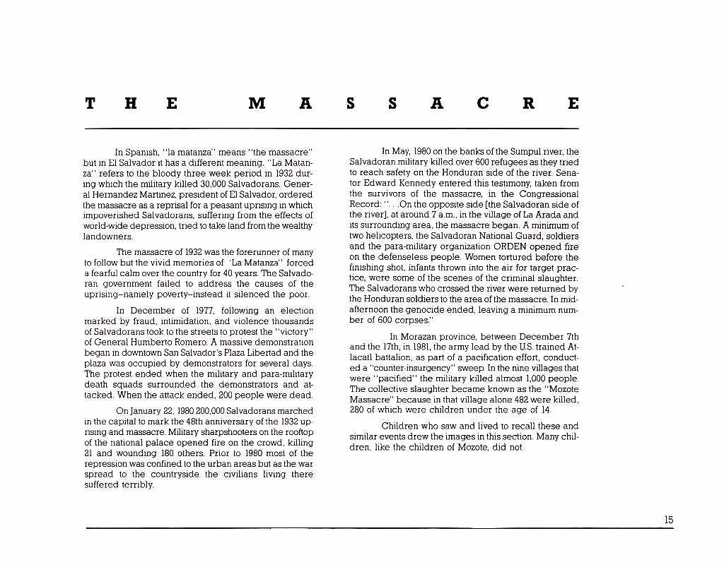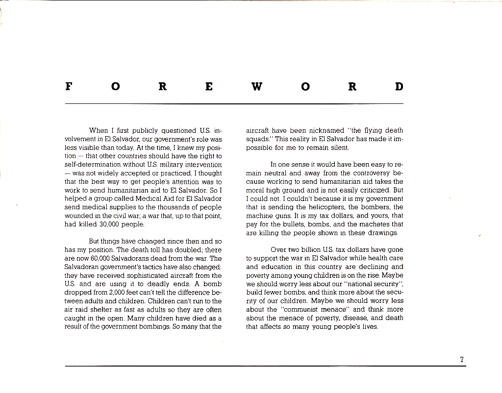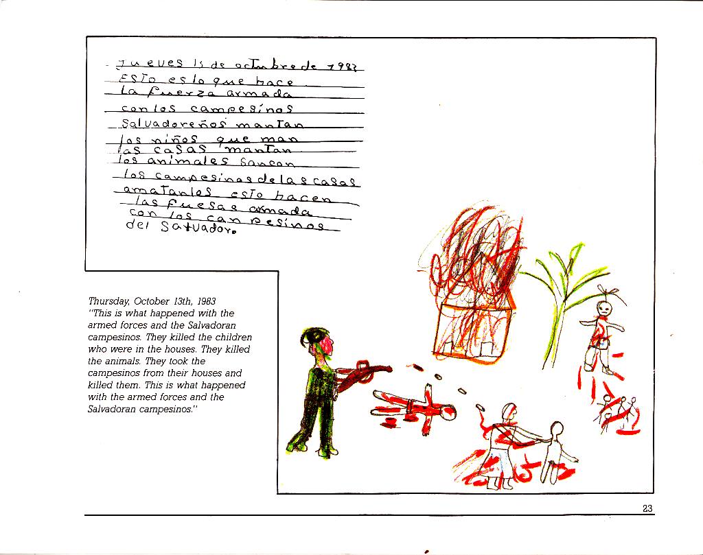 The following images are scanned pages from the book Fire From the Sky — Salvadoran Children's Drawings, published May 1986 by the Writers and Readers Publishing Cooperative; Copyright 1986 by William Vornberger. |