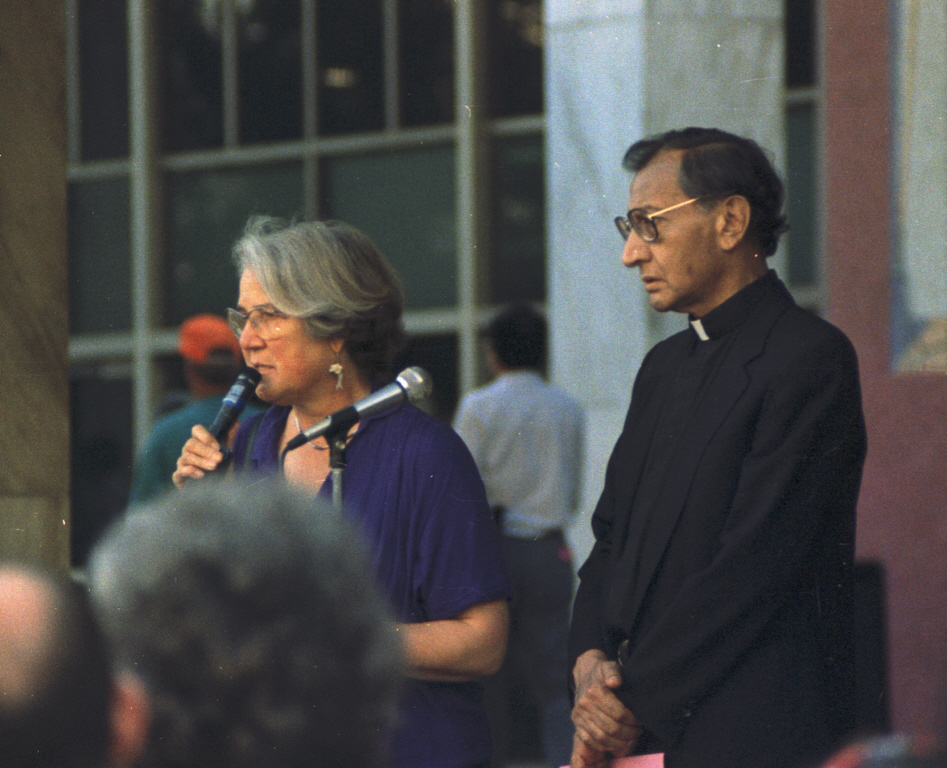Emerson Unitarian Universalist Church member Carroll Trumbull, and UUSC staffer Fiona Knox in front of the Federal Building,