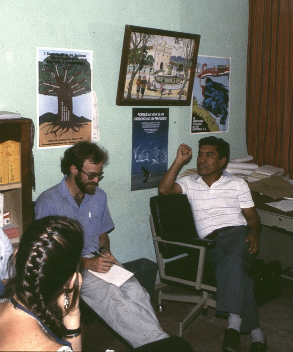 Vitalino Cuca ran a health clinic in Santiago Atitlan. Note the same posters as shown above. Here Andy, another of our Witness for Peace mentors, takes note. I don't recall when Andy joined us; he might have been a long-term delegate to Santiago Atitlan.