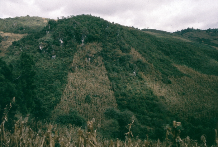 The good land in the valleys is owned by rich Guatemalans, and is used primarily for export crops. To grow food for their families, campesinos must farm the slopes, as shown here. I welcome information as to whether campesinos must rent their space on the slopes from wealthy Guatemalans, or whether they are allowed to own such land themselves.